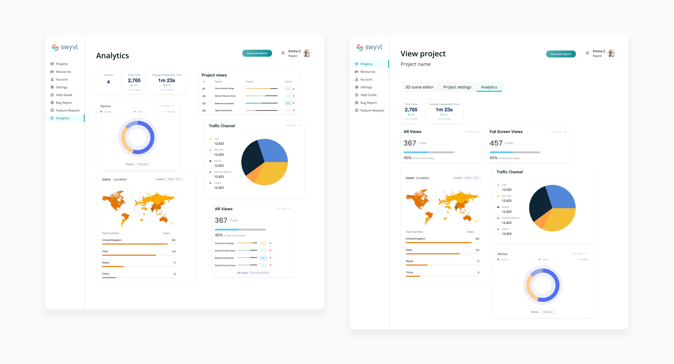 A comprehensive screen for data visualization, empowering both Admins and clients to analyze projects and user behavior. Admins can gain insights into user data, while clients can analyze their 3D projects' performance.