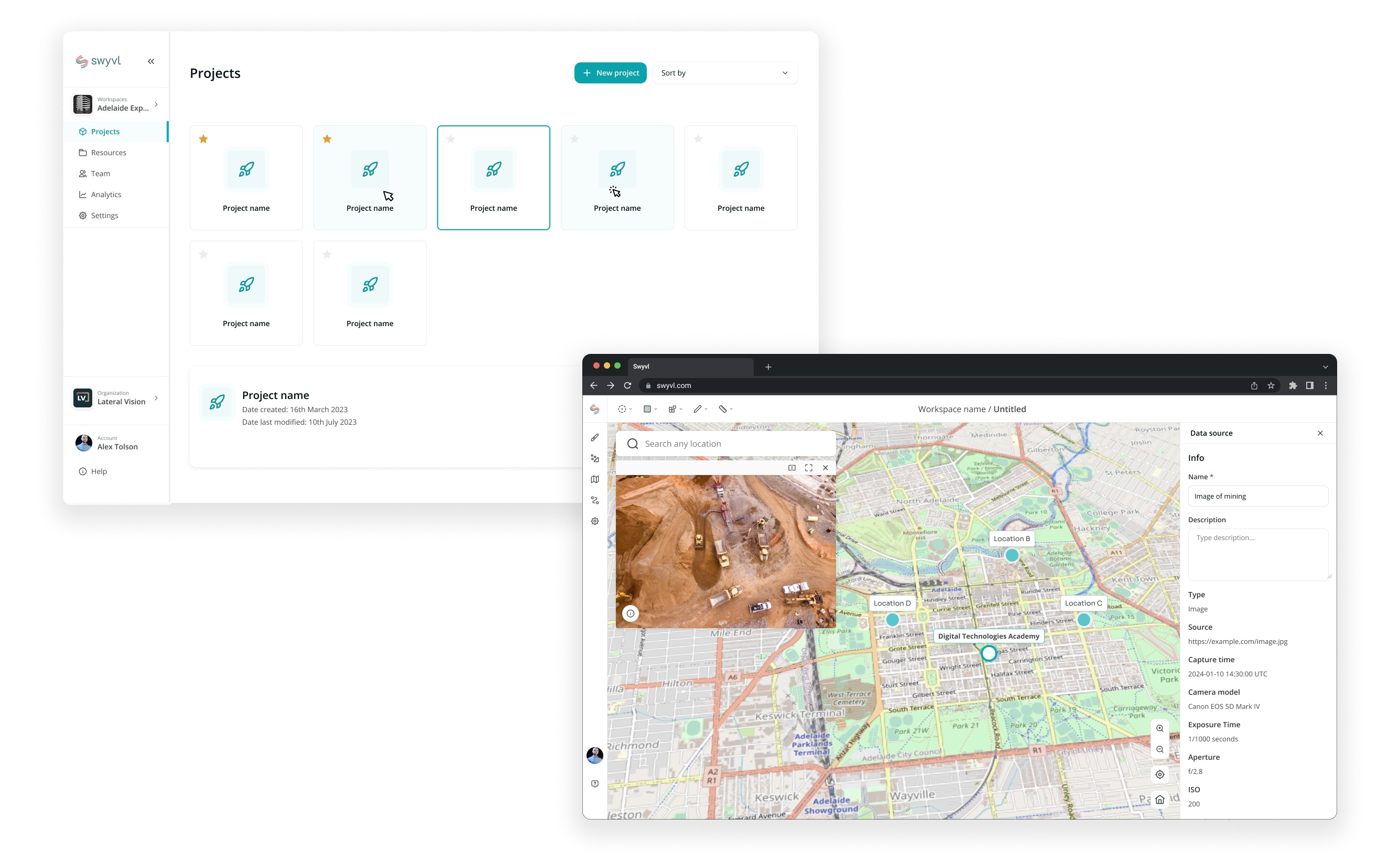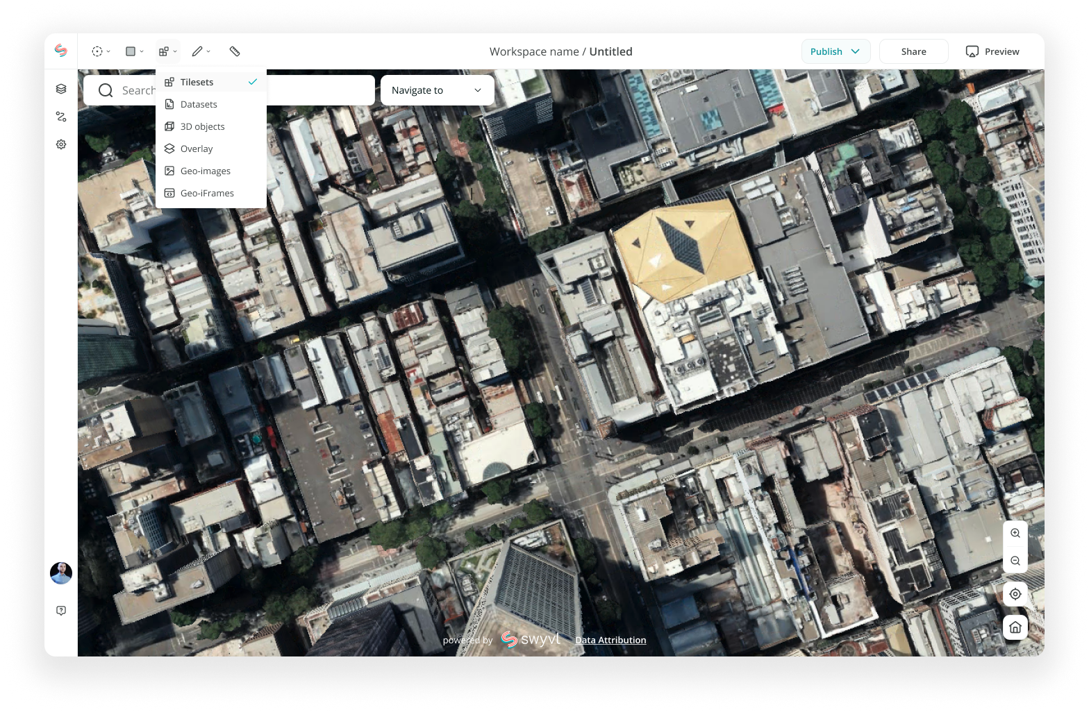 The Swyvl builder lets users upload and organise diverse spatial data — including photos, plans, linework, and 3D models — into a single interactive workspace, enabling configurable virtual site views and efficient team access.