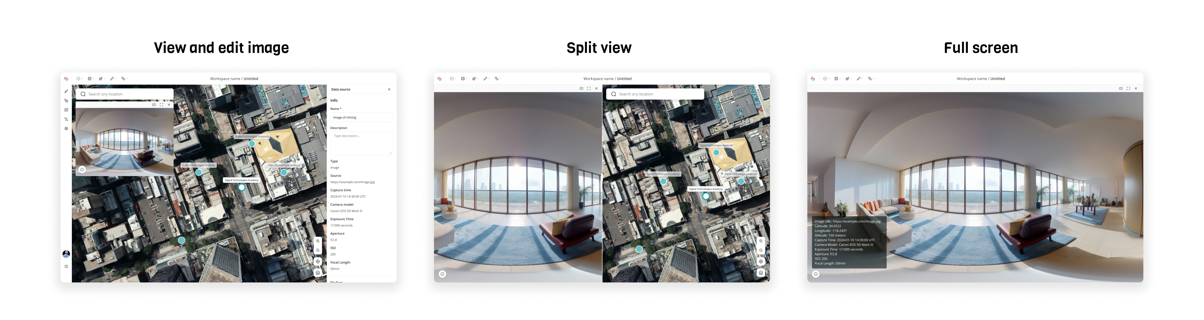 • Build 3D spaces using satellite, plane, drone, or illustrated maps as the base layer, and add additional data points through hotspots